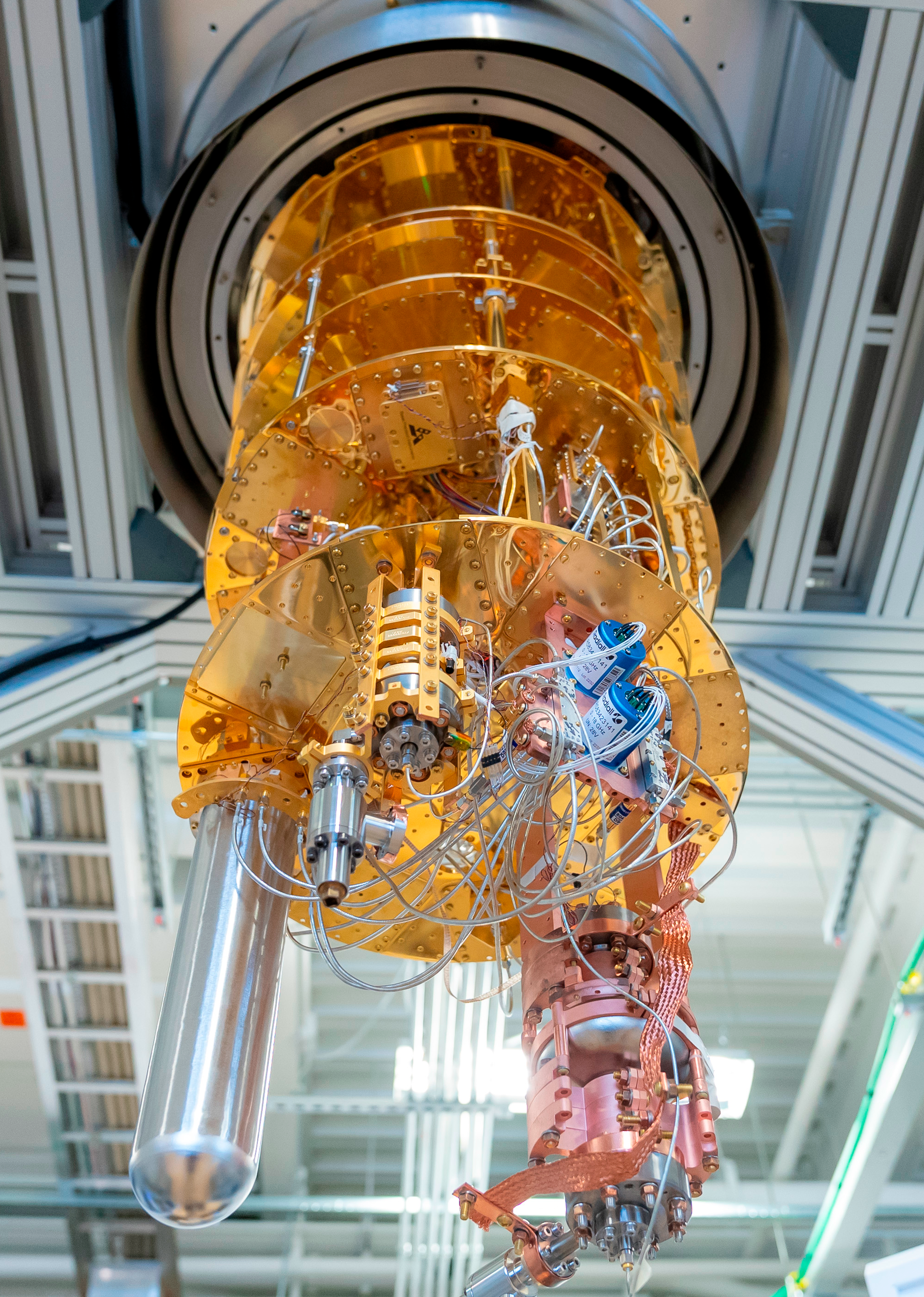 The last few stages of an IBM Q dilution refrigerator, used for cooling quantm chips to low temperatures of a few milli-Kelvin.