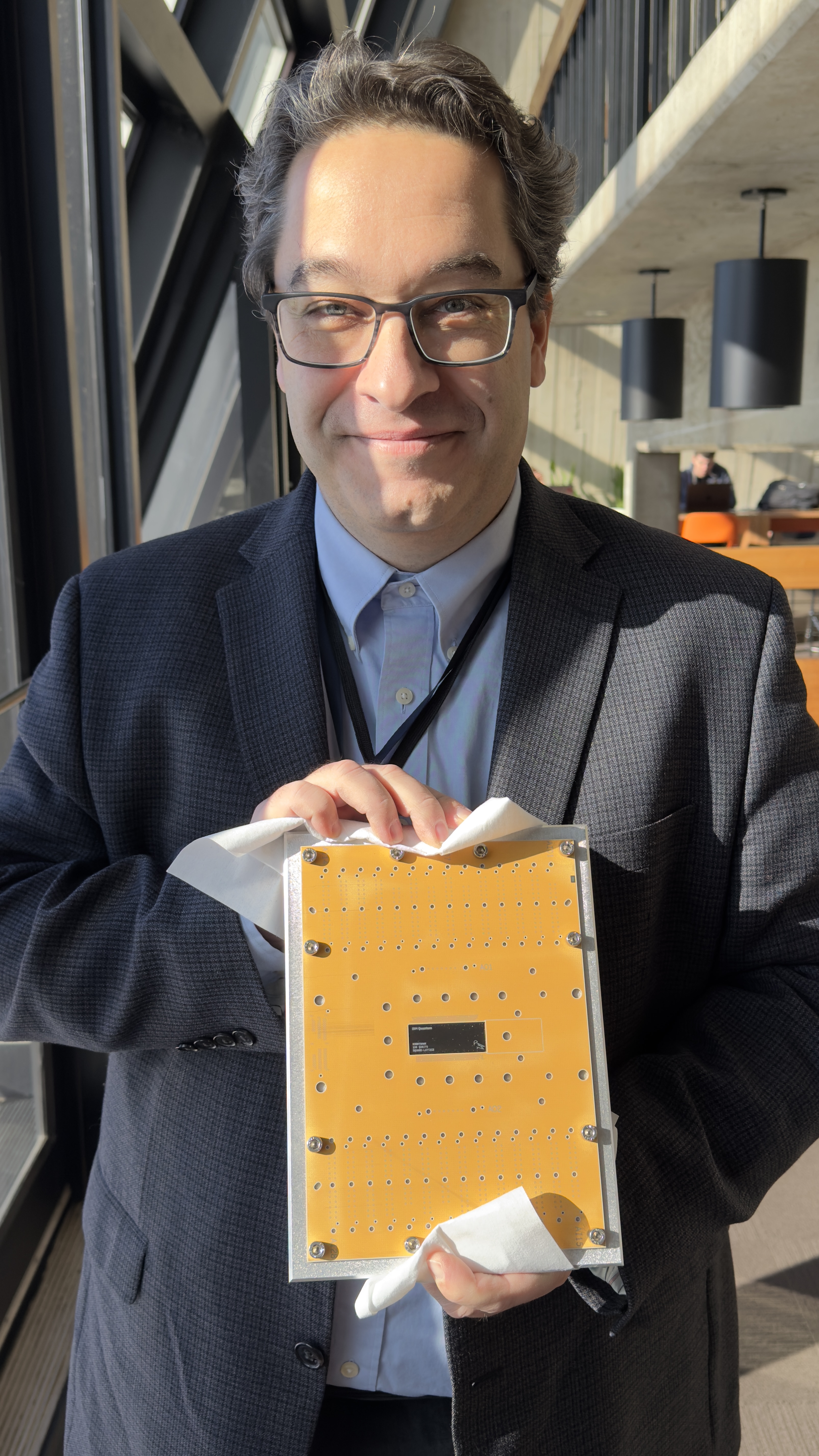 Nikos holding IBM's Nighthawk quantum processor. Nighthawk,